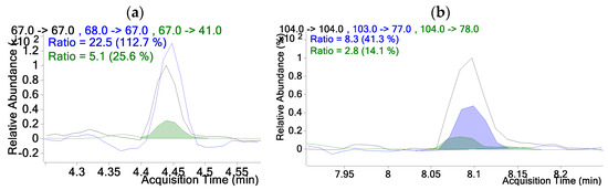 Despite the undisputable benefits of MS/MS in the inclusion of a plethora of compounds in relatively short runtimes, peak resolution is a key step in every analytical work. In this context, sufficient resolution (based on chromatography or/and m/z ions) was achieved, except for m-xylene and p-xylene (Table S1), as it is difficult to resolve with typical VOC columns such as the DB-624 and the same transitions [61,62,63].