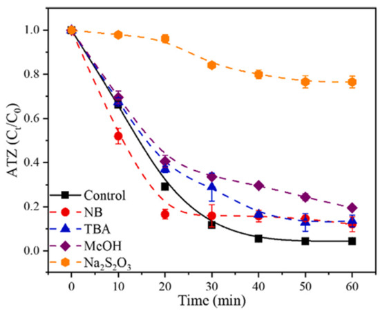 Quenching experiments are important to investigate the contribution percentage of oxidants produced in the E-Cl process. Quenching experiments are accurate methods of analysis since they are based on the results of parallel experiments in which different active substances are selectively removed due to the action of different scavengers. They can reveal the contribution of different oxidants to the degradation of pollutants (Figure 6). Common scavengers include Na2S2O3 for ·OH,·Cl,·Cl2−,·ClO, and free chlorine; nitrobenzene (NB) for ·OH; tert-butylalcohol (TBA) and methanol (MeOH) for ·OH, Cl·,·SO4−, and ClO·; ascorbic acid for ·OH and ·O2−; etc. [10]. Lu et al. [84] found that in the process of ammonia oxidation by the E-Cl system, the contribution of chlorine radicals including Cl· and ClO· accounted for 65.87%, ·OH for 24.55%, and free chlorine for only 9.58%. But the choice of scavengers is actually controversial, so we usually combine several approaches with a view to understanding the mechanism of the E-Cl process.