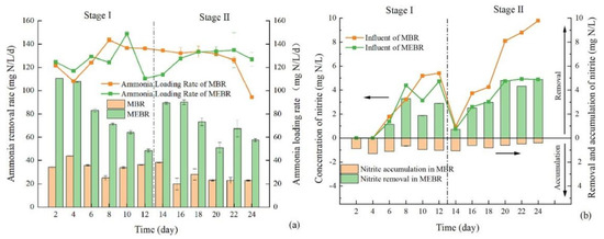 Ammonia nitrogen loading efficiency and removal efficiency (a), Nitrite concentration of influent and removal/accumulation of nitrite (b) in MEBR and MBR [101].