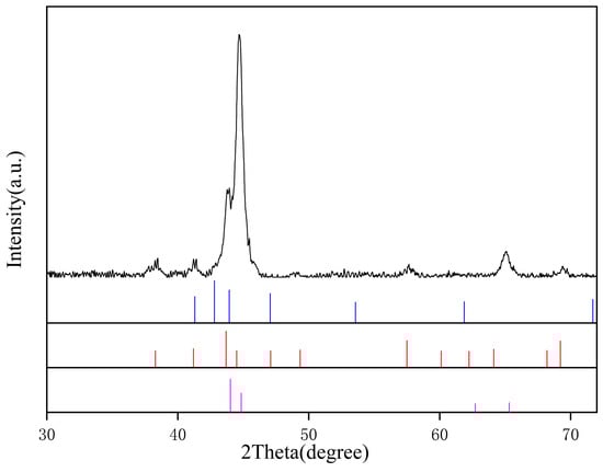 The phase structure of the catalyst was determined by X-Ray diffraction (XRD), as shown in Figure 1. The diffraction peaks at 38.47°, 41.42°, 43.77°, 57.65°, and 69.32° suggested the appearance of Fe3N (PDF#49-1663). The diffraction peaks at 44.02°, 44.84°, and 65.05° indicated the presence of the C0.08Fe1.92 (PDF#44-1291) phase. Peaks at 38.43°, 43.93°, and 45.47° were attributed to graphitic carbon (PDF#50-1082).