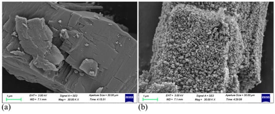SEM of Fe-MOF-C/N-1:0.5 before (a) and after calcination (b).