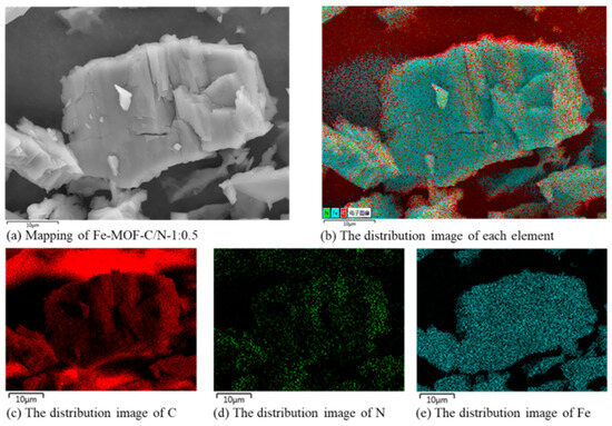 The SEM images of Fe-MOF-C/N before and after calcination (550 °C) are shown in Figure 2. Since the morphology and structure of the material may be changed before and after calcination, the morphology of Fe-MOF-C/N-1:0.5 was observed by SEM. The material presented a smooth surface before calcination (Figure 2a). After calcination (Figure 2b), the surface of Fe-MOF-C/N-1:0.5 presented dense micropores, which was due to the partial removal of the organic ligand at high temperature [15,16]. After calcination, the porous structure of the catalyst could expose more active sites, which was conducive to increasing the contact area between the catalyst and potassium bisulfate, thus improving the efficiency of the material activation of potassium bisulfate [16]. The element distributions of Fe-MOF-C/N-1:0.5 is shown in Figure 3. After calcination, C and N were distributed in similar positions. Fe was the brightest, followed by C and then N. However, the Fe content on the catalyst’s surface was the highest and the distribution was wider.
