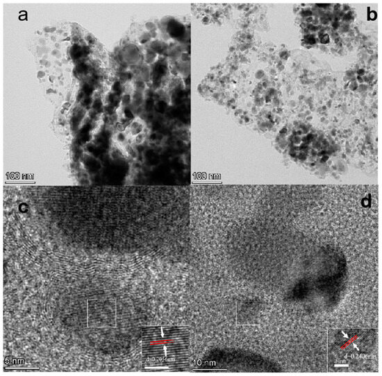 The TEM image of Fe-MOF-C/N-1:0.5 is shown in Figure 4. It was found that the catalyst was coated with carbon. The lattice spacing in Figure 4c was 0.2056 nm, corresponding to the (200) crystal plane of C0.08Fe1.92. The lattice spacing of 0.2406 nm corresponded to the (111) crystal faces of Fe3N (Figure 4d). Combined with XRD images, it could be seen that the catalyst contained C0.08Fe1.92 and Fe3N.