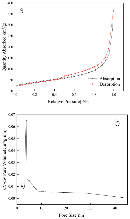 The specific surface area and pore size parameters of the catalyst were obtained from the N2 adsorption/desorption isothermal curve and pore size distribution diagram, respectively, as shown in Figure 5. The results indicated that the average pore diameter of Fe-MOF-C/N-1:0.5 was 15.1274 nm, the pore volume was 0.5595 cm3/g, and the specific surface area was 149.01 m2/g. The N2 adsorption/desorption isotherm of Fe-MOF-C/N-1:0.5 was consistent with the typical type II adsorption/desorption isotherm, and the loop in the 0.4 < P/P0 < 1.0 range of the curve was also consistent with its porous structure.