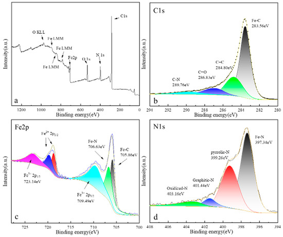 The chemical composition of the prepared catalysts was determined by X-Ray photoelectron spectroscopy (XPS) and the results are shown in Figure 6. It could be seen that the catalyst was mainly composed of four elements: C, N, O, and Fe. The high-resolution spectrum of C-1s is shown in Figure 6b. Binding energies at 283.56 eV, 284.80 eV, 286.83 eV, and 289.76 eV represent C-Fe, C=C, C=O, and C-N, respectively [16,17,18]. The C-Fe bond also proved the presence of C0.08Fe1.92. Figure 6c shows the high-resolution spectrum of Fe-2p. The relative content of 2p3/2 and 2p1/2 orbits of Fe3+ were 19.79% (709.49 eV) and 20.05% (723.14 eV), respectively [19,20,21,22]. Both 705.86 eV (11.51%) and 706.63 eV (18.30%) belong to the 2p3/2 orbitals of Fe2+, corresponding to Fe2+ in the Fe-C and Fe-N bonds, respectively [23,24,25]. 719.68 eV and 718.72 eV correspond to the 2p1/2 orbits of Fe2+. Figure 6d shows the XPS spectrum of N-1s, in which the four peaks of 397.34 eV, 399.26 eV, 401.44 eV, and 403.16 eV correspond to Fe-N bond, pyrrole N, graphite N, and N oxide, respectively [22,25,26,27,28]. Combined with the distribution of elements in Figure 6a–d, XRD, and mapping, it was confirmed that Fe3N and C0.08Fe1.92 were indeed present in the catalyst.