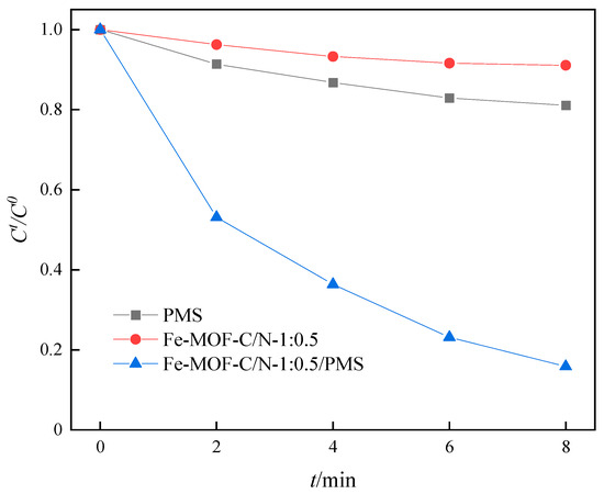 The degradation of SMX in different systems is shown in Figure 7. The degradation rate of SMX in the PMS system was 18.91% in 8 min, and the adsorption degradation rate of Fe-MOF-C/N-1:0.5 for SMX was only 8.9%, indicating that PMS alone could not effectively oxidize SMX, and the adsorption effect of Fe-MOF-C/N-1:0.5 was not high. At the same time, the degradation rate of SMX in the Fe-MOF-C/N-1:0.5/PMS system was significantly increased to 84.17%.