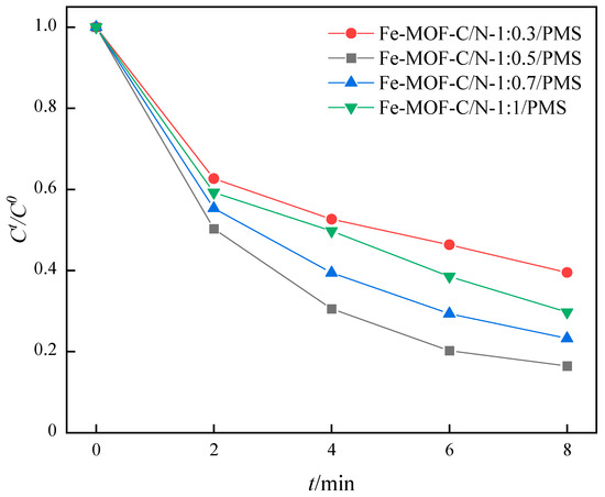 In order to investigate the effect of the mass ratio of precursor Fe-MOF and g-C3N4 on the materials, Fe-MOF-C/N catalysts with different mass ratios were prepared, which were labeled as Fe-MoF-C/N-1:0.3, Fe-MOF-C/N-1:0.5, Fe-MOF-C/N-1:0.7, and Fe-MOF-C/N-1:1, respectively. The activation of PMS to degrade SMX was carried out under the same experimental conditions. As shown in Figure 8, the degradation rates of SMX in the presence of Fe-MOF-C/N-1:0.3, Fe-MOF-C/N-1:0.5, Fe-MOF-C/N-1:0.7, and Fe-MOF-C/N-1:1 were 60.47%, 83.54%, 76.75%, and 70.25%, respectively. With the increase in the proportion of g-C3N4, the active substances in the catalyst might be coated by carbon, thus reducing the degradation rate of SMX [29]. The reason for the low activity of Fe-MOF-C/N-1:0.3 might be that the content of g-C3N4 was too small, resulting in a low content of active substances in the catalyst after calcination [30,31]. The experimental results showed that the catalyst had the best performance when the mass ratio of Fe-MOF to g-C3N4 was 1:0.5.