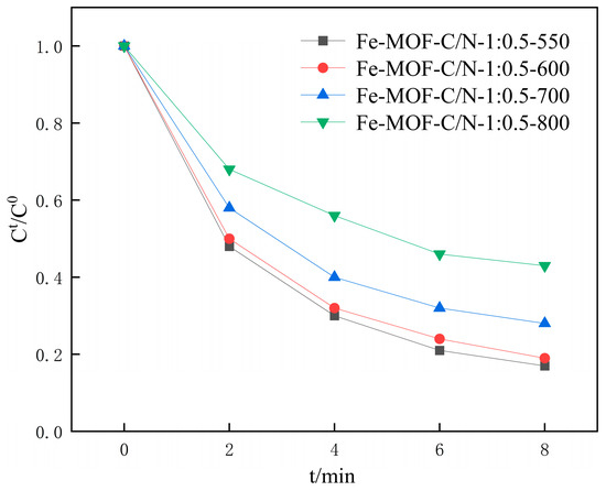 In order to investigate the effect of calcination temperature, catalysts calcined at 550 °C, 600 °C, 700 °C, and 800 °C were prepared and labeled as Fe-MOF-C/N-1:0.5-550, Fe-MOF-C/N-1:0.5-600, Fe-MOF-C/N-1:0.5-700, and Fe-MOF-C/N-1:0.5-800. As shown in Figure 9, the degradation rates of SMX in the Fe-MOF-C/N-1:0.5-550/PMS and Fe-MOF-C/N-1:0.5-600/PMS systems were 83.54% and 81.35%, respectively, The degradation rates of SMX in the Fe-MOF-C/N-1:0.5-700/PMS and Fe-MOF-C/N-1:0.5-800/PMS systems were 74.35% and 61.72%, respectively. The experimental results showed that the catalyst had the best performance when the temperature of Fe-MOF-C/N was 550 °C.