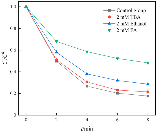 In the PMS-AOPs system, ·OH, SO4−, and 1O2 might be active substances in the degradation of organic matter [32,33]. Tert-butanol (TBA) can react with OH (k = 3.8 − 7.6 × 108 M−1s−1) and was used as a free radical scavenger of OH [34]. Ethanol can be used as a quenching agent for OH and SO4−. The contribution of ·OH and SO4− in SMX degradation could be determined by adding tert-butanol and ethanol to the solution [35,36]. Furfuryl alcohol (FA) could effectively quench 1O2 in the solution [37]. It can be seen from Figure 11 that 1O2 had the greatest effect on SMX degradation, while ·OH and SO4− had little effect on SMX degradation.