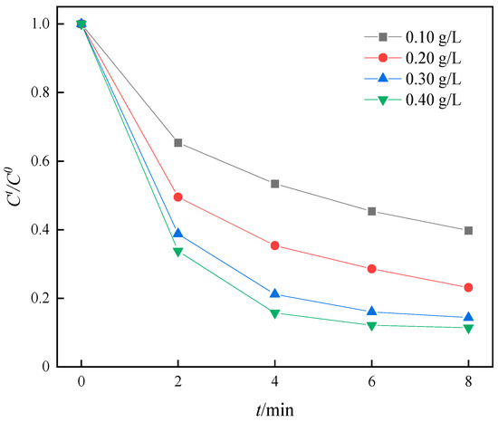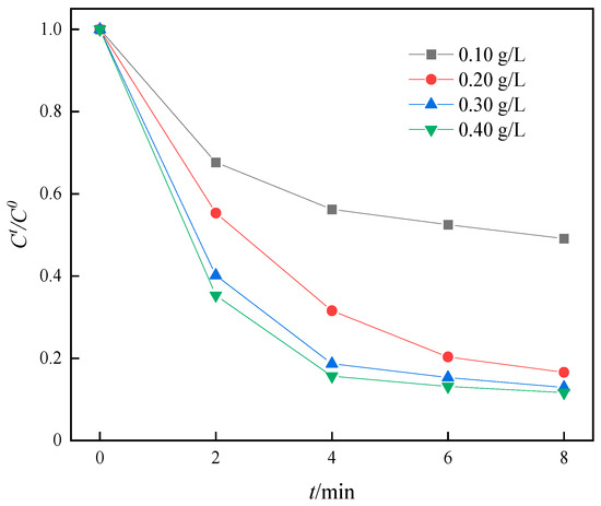 As shown in Figure 14, when the PMS dosage was 0.20 g/L, the degradation rates of SMX were 60.21%, 76.86%, 85.62%, and 88.60%, respectively, as the Fe-MOF-C/N-1:0.5 dosage was elevated from 0.10 to 0.40 g/L. And within 2 min, the higher the catalyst dosage was, the faster the SMX content in the solution decreased, which indicated that the dosage of the catalyst affects the degradation rate of the organic matter in the solution. In addition, the adsorption effect of Fe-MOF-C/N-1:0.5 on SMX is shown in Figure 15, and the SMX removal rate increased with the rise in catalyst dosage. Based on the above results, the optimal dosages of PMS and Fe-MOF-C/N-1:0.5 for the activation of PMS for SMX degradation were 0.30 g/L and 0.40 g/L, respectively.