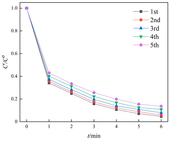 Recycling test of Fe-MOF-C/N-1:0.5 for activating PMS. Reaction conditions: SMX solution (200 mL 50 mg/L); PMS and Fe-MOF-C/N (0.20 g/L).