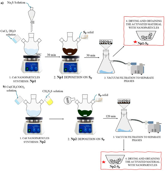Activation process with the deposition of CuS nanoparticles synthesized by (a) M1 and (b) by M2.