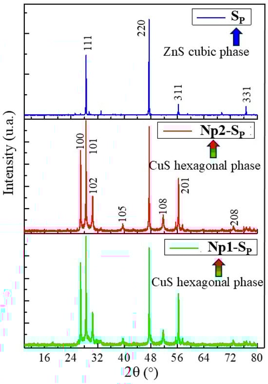 The XRD pattern of SP (Figure 2) shows characteristic peaks at 28.63°, 47.58°, 56.16° and 76.6°, which correspond to (111), (220), (311), and (331) planes of the cubic phase of ZnS [30]. When nanoparticles were deposited, new diffraction peaks at 26.83°, 30.56°, 39.56°, 51.83°, 73.10° associated with (100), (102), (105), (108), and (208) planes of the hexagonal phase of CuS can be observed. There are two possible peaks (28.38° and 56.21°) that are associated with this same phase and correspond to (101) and (201) planes, but they overlap with the peaks of SP. This information is confirmed by Harish et al. [31] and Yadav et al. [32]. The slight difference in the intensities of the peaks could be related to the number of nanoparticles deposited on the surface.