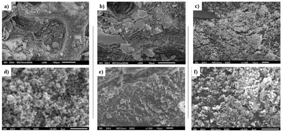 SEM micrographs of Np1-SP and Np2-SP are shown in Figure 3. In Figure 3a,b, it can be observed that the particles were deposited on the grain boundaries of the SP material. A high degree of agglomeration with flake-like irregular particles can be observed on both materials (Np1-SP and Np2-SP). The agglomeration is due to the high amount of precursors, considering that the growth rate is proportional to sulfur concentration. According to the Cu/S ratio, the largest particle size was obtained by M1 (Cu/S = 0.44) instead of M2 (Cu/S = 0.08) [34].