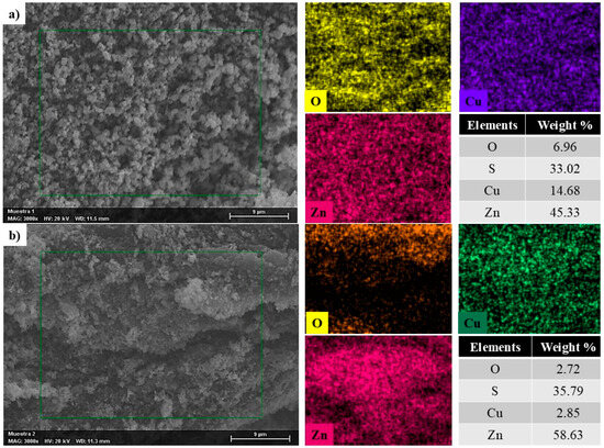 EDS analysis shows the presence of copper and sulfur on SP. The (Cu+Zn)/S ratio in Np1-SP (Figure 4a) was 1.82 and 1.72 in Np2-SP (Figure 4b). These results confirm that the particle deposition is favored when the sulfur source comes from Na2S instead of from thiourea. Pal et al. [9] reported that the low composition of copper is characteristic of the CuS phase, although other copper phases may form (Cu(OH)2). Another important factor is temperature; when this variable increases, the exchange rate between Cu2+ and Zn2+ is favored, like in Np1-SP. The percentage of copper increased when synthesis was achieved at high temperature (70 °C), indicating that the deposition of copper ions is favored when the temperature increases from 25 °C (M2) to 70 °C (M1). This behavior is also reported by Gao et al. [32]. According to chemical mapping, it is observed that the deposited particles were uniformly distributed over the entire surface of the SP material.