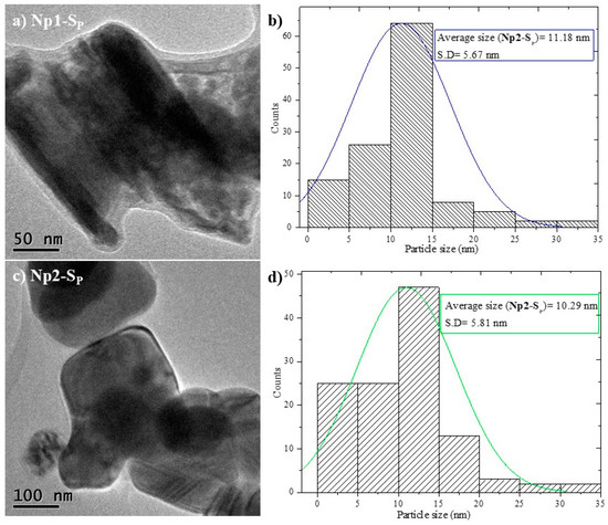 Figures show TEM images of Np1 (Figure 5a) and Np2 (Figure 5c). It seems that the most significant spheres (greater than 100 nm) are formed by the aggregation of small nanoparticles, whose average size ranges from 11.18 nm to 10.29 nm for Np1 (Figure 5b) and Np2 (Figure 5d), respectively. Large structures such as nanolayers contain small nanoparticles inside (Figure 5a), and the morphology is spherical in Figure 5c.