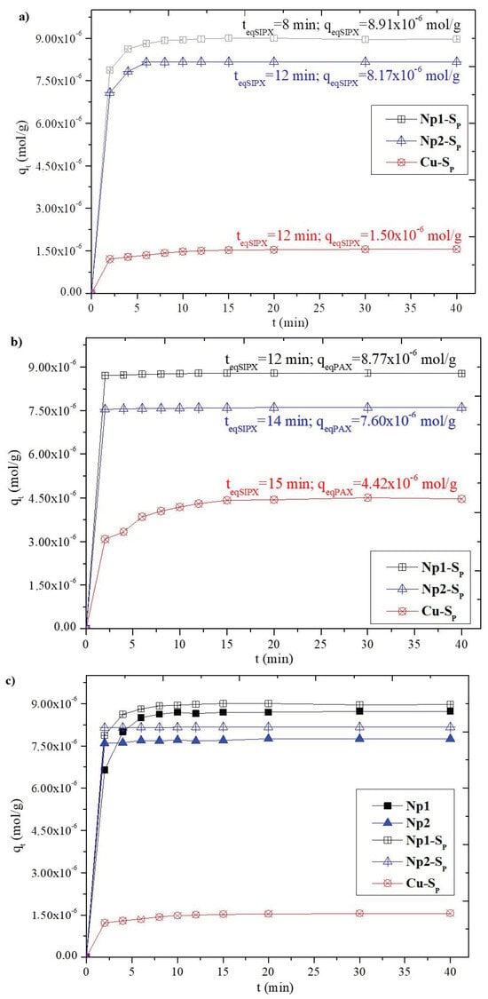 Kinetics adsorption processes were better described using a Modified Ritchie Second-Order Model and Avrami fractional order model (Table 1). For Np1-SP, SIPX was adsorbed on the active surface sites, but the process cannot be limited to a surface reaction because nA (0.59) is less than unity. A value between 0.2 and 0.8 points out that the collector should be distributed uniformly and homogeneously on the surface [42,43]. For PAX adsorption, the value of nA (0.08) decreases, which suggests that the structure of the collector must cause some change in the binding mechanism, probably related to some diffusion-controlled process. Similar results were obtained by Knezevic et al. [44]. The interaction between the surface sites of materials and the SIPX collector was electrostatic. Comparing the pH of the solution after collector adsorption (pHNp1-Sp-SIPX = 6.12) with pHzpc determined by Np1-SP material (6.21), the surface charge is positive; therefore, the electrostatic interaction between Cu2+ and the functional group of collectors (sulfur ion) is viable.