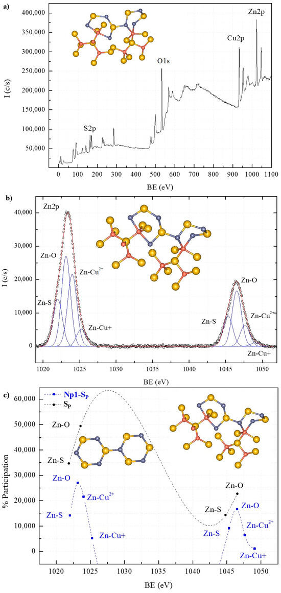 Zinc was deconvoluted with an FWHM of 1.5±0.1. Four states were found (Figure 7b): for Zn2p3/2: Zn-S (1021.9 eV), Zn-O (1023.1 eV), Zn-Cu2+ (1023.9 eV) and Zn-Cu+ (1025.1 eV); for Zn2p1/2: Zn-S (1045.2 eV), Zn-O (1046.5 eV), Zn-Cu2+ (1047.6 eV) and Zn-Cu+ (1049.1 eV). These values coincide with those reported by Zhu et al. [50]. Comparing the Zn2p spectra of SP and Np1-SP (Figure 7c), the energy values of Zn-S and Zn-O are similar. New peaks appear at binding energy values that correspond to more oxidized chemical species. It is important to reiterate that the deposition is carried out in an aqueous medium that promotes surface oxidation, so it is normal to expect Zn-O-type interactions but also Cu-O in different oxidation states.