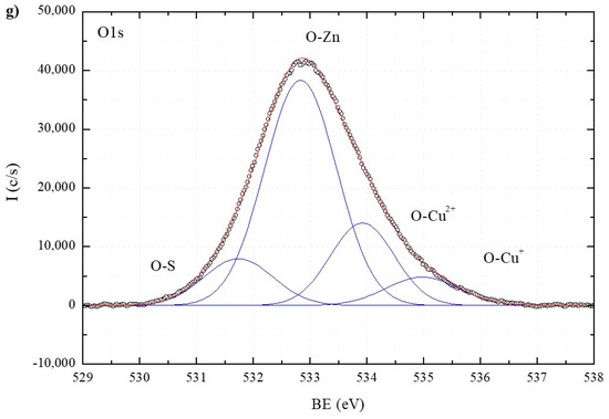 When the O was deconvoluted with an FWHM of 1.4±0.1, four peaks (Figure 7g) were obtained for O1s: O-S (531.7 eV), O-Zn (532.7 eV), O-Cu2+ (533.9 eV) and O-Cu+ (534.9 eV). It should be noted that, due to the aqueous medium, surface oxidation occurs. Consequently, interactions of the O-Zn and O-S type, as well as Cu-O in different oxidation states, are expected to be observed.
