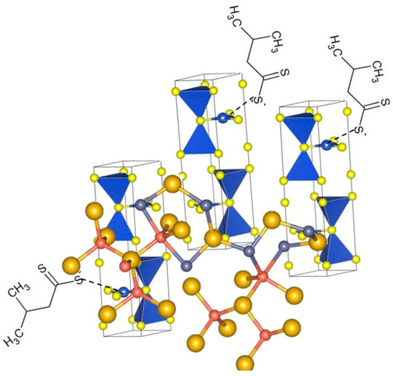 After the activation of sphalerite, the second stage is the adsorption of collector molecules (Figure S3) [12]. The interaction between the polar head (collector) and the activated sphalerite leaves the non-polar tail of the collector oriented towards the bulk solution, increasing the hydrophobicity [13]. The latter is an essential requirement for flotation to occur efficiently [14]. In the literature, xanthate collectors can favor the flotation process to recover zinc. Kondrat’ev and Gavrilova [15] reported that the newly formed copper xanthate can attach to the sphalerite mineral surface more strongly than zinc xanthate, because the first compound has a lower solubility product value (Kps Cu-xanthate = 5.2 × 10–20) than the second (Kps zinc-xanthate = 4.9 × 10–9). They also reported that the chain length changes the hydrophobic response [16].