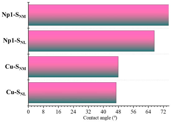 The H2O contact angle of SNL, Cu-SNL, and Np1-SNL was determined. For this purpose, a drop of H2O was deposited on the material polished and exposed in the test tube. Subsequently, the drop was illuminated with diffused light to produce a sharp-edged image. Finally, the photo was captured, and the contact angle was measured.