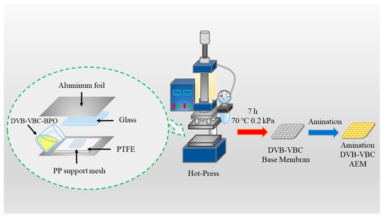 The solution was cast onto polypropylene (PP) fiber and sandwiched between polytetrafluoroethylene (PTFE) sheets and high-strength refractory glass, which facilitated careful covering along one side to minimize bubble formation (Figure 1). The device was wrapped in aluminum foil to reduce monomer volatilization [43]. Initial pre-polymerization was conducted at 30 °C for 1 h, after which the device was transferred to a hot press and reacted at 70 °C and 0.2 kPa for 7 h [43]. Following polymerization, the base membrane, approximately 0.3 mm thick, was detached from the PTFE sheet and glass. Subsequently, the base membrane was immersed in a trimethylamine (TMA) solution at 25 °C, with varying concentrations and amination times (Table 1) applied to different cross-linked base films [43,44]. After amination, the anion-exchange membrane (AEM) was removed from the solution, thoroughly washed with deionized (DI) water, and soaked in 3 mol·L−1 NaCl solution for 24 h to convert it into its chloride carrier form.