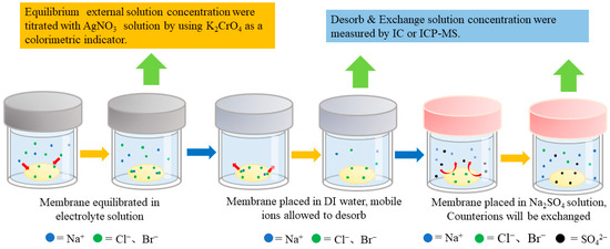 The “equilibrium–desorption–exchange” step was employed to measure concentrations within the AEM [10], as illustrated by the different colors in this figure. After the AEM reached swelling equilibrium in the solution, the internal co-ions (Na+) and some counter-ions (Cl−, Br−) contributed by mobile electrolytes could be determined through multiple desorptions of secondary water. Subsequently, the electrostatically bound counter-ions on the fixed groups were exchanged with a 0.1 mol·L−1 Na2SO4 solution.