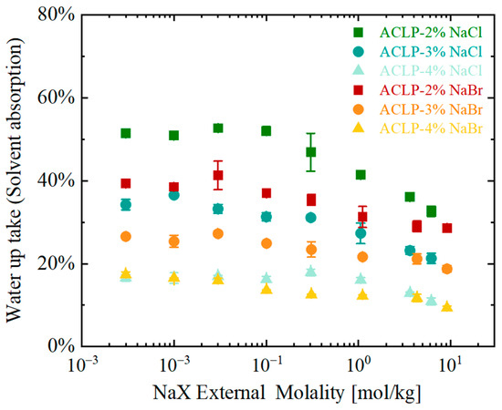 Based on this, the solvent absorption of three types of AEMs (ACLP-2%, ACLP-3%, and ACLP-4%) in NaCl and NaBr solutions was obtained. The experimental results are presented as a function of the molality of the external solution and the water uptake of the ion-exchange polymer (solvent absorptivity), as shown in Figure 3.