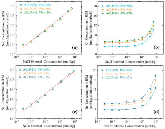 The molal concentrations of co-ions, , and counter-ions, (X = Cl, Br), in the anion-exchange polymer are presented as a function of external electrolyte concentration for NaCl (a,b) and NaBr (c,d).