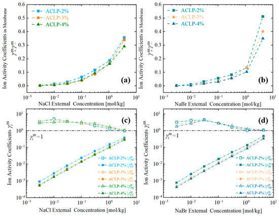 The influence of external electrolyte concentration on the activity coefficients of the membrane in NaCl (a) and NaBr (b) is presented and obtained experimentally via Equation (10). Additionally, the respective ionic activity coefficients of the co-ions (c) and counter-ions (d) in the membrane were determined experimentally using Equation (7).