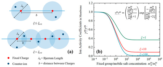 (a) illustrates the scenarios described by Manning’s theory, specifically for the cases where b > λb and b < λb. In the case where b < λb, the overlap of the Bjerrum length creates a localized energy minimum region where counterions are likely to reside, leading to “counterion condensation” [28]. (b) mathematically presents the left and right limits predicted by the Manning model under this assumption, as expressed by Equation (13).