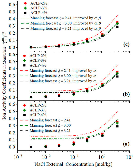 Ion activity coefficients in ion-exchange membranes as a function of external NaCl concentration obtained experimentally (ACLP-2% (●), ACLP-3% (◆), and ACLP-4% (■)) and predicted by Manning’s limiting laws (ACLP-2% (red dashed line), ACLP-3% (green dashed line), and ACLP-4% (black dash-dotted line)). As shown in (a), (b), (c), respectively, represent the introduction of correction parameter α; and the prediction results after introducing correction parameters α and β.