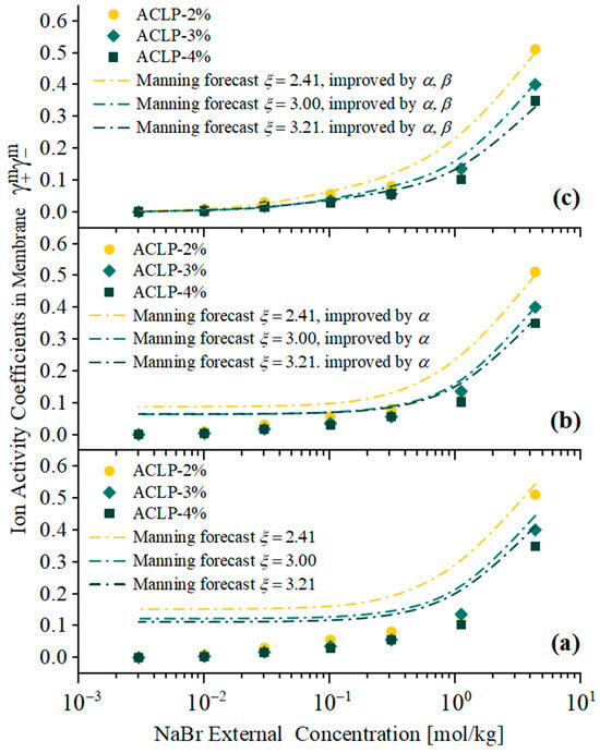 Ion activity coefficients in ion-exchange membranes as a function of external NaBr concentration obtained experimentally (ACLP-2% (●), ACLP-3% (◆), and ACLP-4% (■)) and predicted by Manning’s limiting laws (ACLP-2% (yellow dashed line), ACLP-3% (teal dashed line), and ACLP-4% (indigo dash-dotted line)). As shown in (a), (b), (c), respectively, represent the introduction of correction parameter α; And the prediction results after introducing correction parameters α and β.