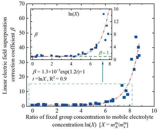 where represents the ion activity coefficient influenced by the modified multi-segment polymer chain, while denote the activity coefficients resulting from the line-to-point interaction of the single-segment polymer chain in the null hypothesis, the coefficient β serves as the linear electric field superposition correction coefficient. Under this assumption, β should be a function of the fixed group concentration and the mobile salt concentration . By fitting the data from the NaCl experimental group shown in Figure 10, the empirical model expression for β in relation to can be derived as follows: