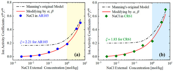 Two commercially available ion-exchange membranes AR103 (ξ = 2.21) and CR61 (ξ = 1.83), which were known linear charge densities [10], were used to further explore the applicability of the modified model. Equation (26) and the above algorithm were used to estimate the ionic activity coefficient values of NaCl in the membrane, and these data were compared with the experimental values and the values predicted by Manning’s original model. The results are shown in Figure 11.