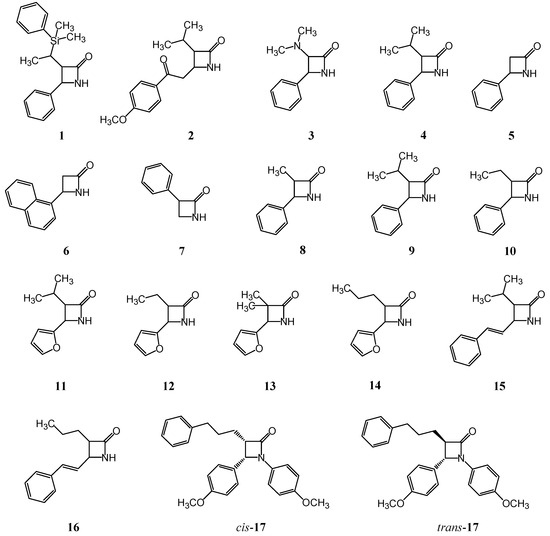 Azetidin-2-ones, also known as β-lactams, are four-membered cyclic amides [1,2,3,4]. The β-lactam ring is the central structural element responsible for the antibacterial activity of β-lactam antibiotics, which are among the most commonly used types of antibiotics, such as penicillins, carbapenems, cephalosporins, nocardicins, and monobactams [5]. In addition, they show numerous other interesting pharmacological activities, such as cholesterol absorption inhibitors, human cytomegalovirus protease [6], tryptase and chymase inhibitors, thrombin inhibitors [5], and LHRH antagonists [7]. β-Lactams also have anticancer, antiviral [8], antitubercular, antifungal [6], anti-HIV, anti-inflammatory, and other biological activities [9]. β-Lactams can serve as building blocks for the synthesis of other compounds of biological and medicinal importance, such as β-amino acids, peptides, peptidomimetics, taxoids, alkaloids, and various heterocyclic molecules [7,10].