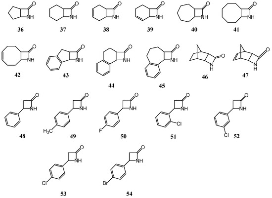 Chemical structures of bi- and tricyclic and 4-aryl-substituted β-lactams 36–54.