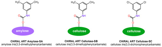 The HPLC columns were packed with the immobilized chiral polysaccharide-based stationary phases from YMS CHIRAL ART Amylose-SA, CHIRAL ART Cellulose-SB, and CHIRAL ART Cellulose-SC. The size of the columns was 250 mm × 4.6 mm i.d., and the particle size was 10 μm. In the following text, these columns are referred to as Amylose-SA, Cellulose-SB, and Cellulose-SC. The chiral selectors in Amylose-SA, Cellulose-SB, and Cellulose-SC are amylose tris(3,5-dimethylphenylcarbamate), cellulose tris(3,5-dimethylphenylcarbamate), and cellulose tris(3,5-dichlorophenylcarbamate), respectively; all three are shown in Figure 5.