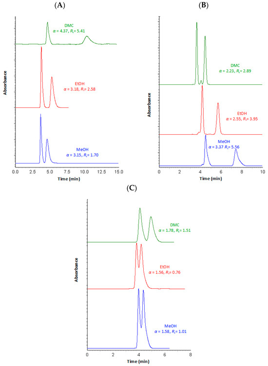 Effect of mobile phase composition on enantioseparation of cyclopentyl urea 63 on Amylose-SA (A), 3-chloro-4-methyl urea 60 on Cellulose-SB (B), and 4-tert-butylphenyl urea 65 on Celulose-SC (C) under HPLC conditions. Chromatographic conditions: mobile phase, MeOH (—), EtOH (—), and DMC (—); flow rate, 1 mL min−1; detection, 254 nm; temperature, 35 °C.