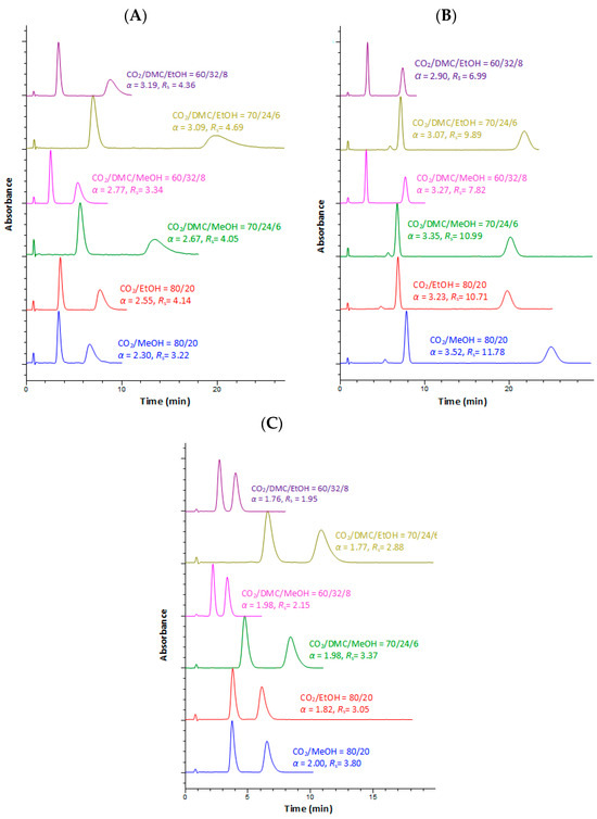 The most successful composition of the mobile phase is different for each stationary phase. For Cellulose-SB, the mobile phases CO2 with MeOH as the organic modifier perform slightly better than those with only EtOH or with alcohol modifier/atypical solvent mixture (MeOH/DMC or EtOH/DMC). For Amylose-SA and Cellulose-SC, the mobile phases with CO2/EtOH and CO2/EtOH/DMC provide better separation than the other mobile phases used. Overall, as described above, Amylose-SA provides the most baseline and partial enantioseparations and thus has the highest success rate under these conditions.