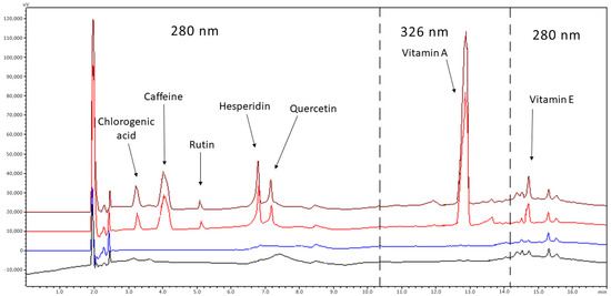 Chromatograms of blank emulsion (black line), blank diluent (blue line) of a standard solution (red line) and spiked sample (brown line). Concentrations: 4 μg/mL chlorogenic acid, 2 μg/mL caffeine, 2 μg/mL rutin, 3 μg/mL hesperidin, 2 μg/mL quercetin, 3 μg/mL vitamin A, 4 μg/mL vitamin E. Analytes between the dashed lines are detected at 326 nm, while outside at 280 nm.