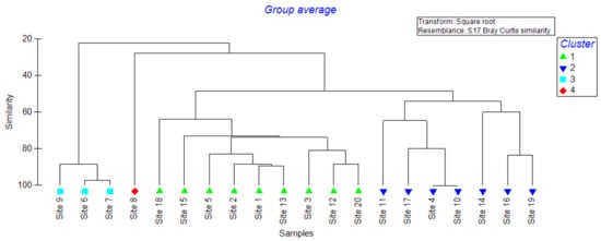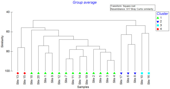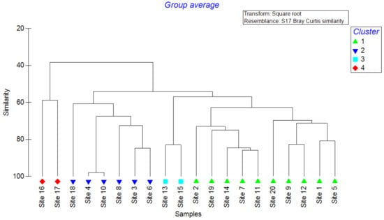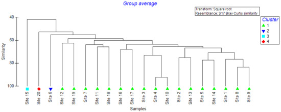 Interestingly, a total of 21 pesticide residues (Chlorpyrifos methyl, Dimethoate, Chlorpyrifos, Lindane (γ–HCH), Bromophos methyl, Methidathion, Heptachlor, Endosulfan, Bifenthion, Permethrin, Cyfluthrin, Resmethrin, Mevinphos, Deltamethrin, Tetramethrin, Azinophos-ethyl, Cypermethrin, Ethoprophos, Carbaryl, Phosmet, and Fenoxycarb) (Table 1) were found in the topsoil samples collected at the 0–10 cm depth. The pesticide Cypermethrin remained the most abundant pesticide residue, reported at nineteen sites, while Mevinphos was reported only at two sites (Table 3). Fenoxycarb reported the highest residual level (0.53 ± 0.11 ppm), while Mevinphos reported the lowest (0.14 ± 0.08 ppm). Four main clusters were observed based on the dendrogram of the cluster analysis (Figure 4), where sites 6, 15, and 20 formed three clusters, while the rest formed the fourth cluster. This clustering status was further verified based on the Global R (0.93) value of the ANOSIM. Site 6 reported relatively higher levels of Heptachlor (0.58 ± 0.17 ppm), Resmethrin (0.88 ± 0.04 ppm), and Phosmet (0.43 ± 0.09 ppm). On the contrary, higher levels of Dimethoate (0.62 ± 0.29 ppm), Endosulfan (0.97 ± 0.11 ppm), and Fenoxycarb (1.18 ± 0.19 ppm) were reported at Site 15. Meanwhile, the presence of Bromophos methyl (1.09 ± 0.24 ppm), Cyfluthrin (022 ± 0.02 ppm), Cypermethrin (1.08 ± 0.36 ppm), Fenoxycarb (1.39 ± 0.23 ppm), and Permethrin (0.60 ± 0.21 ppm) at higher levels could be the reason for Site 20 to remain as a separate cluster (Table 3). It was evident that both sites 13 and 15 clustered together, while sites 16 and 17 formed another subset. Meanwhile, sites 3, 4, 6, 8, 10, and 18 formed the third cluster (Figure 4).