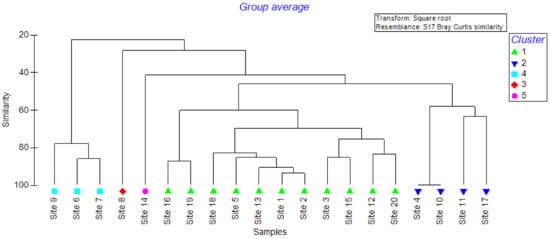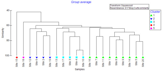 In the soil samples collected at the 10–20 cm depth, both Cypermethrin and Resmethrin remained the most abundant, and were reported in 19 sites. On the contrary, Mevinphos was only reported at two sites, namely Sites 3 and 6 (Table 3). Fenoxycarb reported the highest mean residual level among the 20 sites at 0.64 ± 0.13 ppm, followed by Cypermethrin (0.56 ± 0.07 ppm) and Carbaryl (0.53 ± 0.079 ppm). Meanwhile, Mevinphos reported the lowest average residual level (0.13 ± 0.01 ppm), as shown in Table 3. Based on the overall residual effect of all 21 pesticides, the study sites denoted five significant clusters, which remained substantial according to the ANOSIM (Global R of 0.87). Sites 3, 4, 10, 13, and 17 that reported relatively higher levels of Cypermethrin and Lindane (γ–HCH) made one cluster (Figure 5). The second cluster was made with sites 2, 6, 12, and 19, which were characterized by notable Ethoprophos, Heptachlor, and Resmethrin levels. The highest Fenoxycarb (1.26 ± 0.22 ppm) and Endosulfan (0.89 ± 0.04 ppm) levels in Site 15 remained as the third cluster. Site 18 reported the highest residual levels of Deltamethrin (1.22 ± 0.19 ppm), Lindane (1.24 ± 0.22 ppm), and Tetramethrin (1.78 ± 0.14 ppm) and formed the fourth cluster, while the remaining sites formed the fifth (Figure 5).