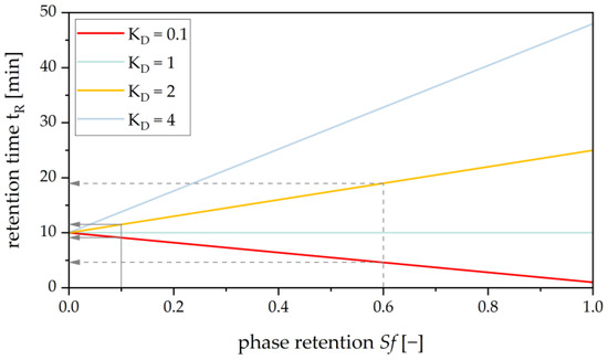 This relation is depicted in Figure 1. For components with a KD < 1, the retention volume () and the retention time () increase with decreasing Sf. In contrast, decreases with decreasing Sf for components with a KD > 1 [13]. The phase retention is critical for a separation task aiming to separate a component A with a KD = 2 from a component B with a KD = 0.1. A chromatographic plant with a low Sf value of 0.1 can not separate these components with high efficiency because the retention times would resemble one another (9 min vs. 11 min, cf., solid arrows in Figure 1). The resulting chromatographic peaks would overlap, and the corresponding resolution would be low. The same plant would separate both components with a high efficiency when operated with a phase retention of 0.6. In this case, the corresponding retention times would be 5 min and 19 min (dashed arrows in Figure 1), implying baseline-separated peaks and, therefore, a sufficient resolution. Consequently, phase retention is a crucial parameter to investigate when optimizing separation efficiency in Centrifugal Partition Chromatography. Aggravating this, the immobilization of the stationary phase inside the apparatus is not ideal: the stationary phase leaks out of the chromatograph during operation, the so-called bleeding. Bleeding is caused by imperfect coalescence of the mobile phase at the outlet of each chamber inside the rotor. After being dispersed in the stationary phase initially, the mobile phase coalesces (boosted by centrifugal force). Nevertheless, droplets of the stationary phase remain in this coalescence zone and elute with the mobile phase flow [13,19,27]. Consequently, the resolution decreases over time, which cuts productivity.