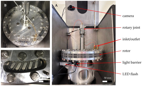 The electric motor can provide 200 to 2000 rounds per minute. The chromatograph was operated at 750 rpm for all experiments to avoid high wear. When triggered once per revolution, the light barrier sends a signal to a controller (RT420cc, Gardasoft, Cambridge, UK). After an adjustable delay, this control unit simultaneously actuates the LED flash and the monochromatic camera. For different rotation speeds, various delays are programmed. Raw data is sent to a Labview instance (Labview 2020, National Instruments, Austin, TX, USA). The script automatically collects images in one video per viewing window. The data acquisition is controlled, so videos are saved in an adjustable time interval. Two rotary joints are necessary to establish a continuous fluid flow inside the chambers and ducts of the spinning rotor. Those mechanical components ensure a tight seal between non-rotating capillaries from the pumps and rotating capillaries connected directly to the rotor itself (cf., Figure 1). Two identical pumps (Azura P2.1S, Knauer, Berlin, Germany) are installed.
