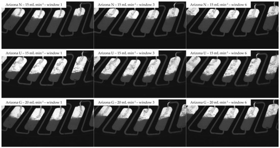 For the following retention experiments, 15 mL⋅min−1 was chosen as the volumetric flow rate for Arizona N, as the favored highly dispersed flow regime is formed here. At the same time, no signs of an atomized regime are evident.