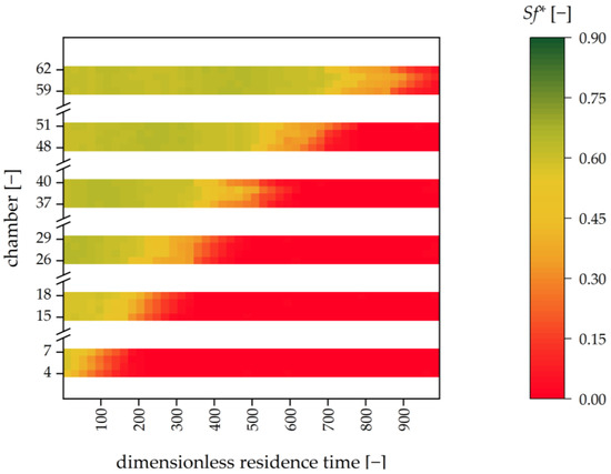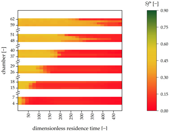 As mentioned, the volumetric flow rate was set to 15 mL⋅min−1. The dimensionless residence time is calculated based on the hydrodynamic residence time being 0.69 min for the given setup. The heatmap shows that all inspection windows start with retention values between 0.42 and 0.46. From this value, the first inspection window (chambers 4–7) loses stationary phase quickly, resulting in a mean Sf* of 0.15 after 43 dimensionless residence times only. This equals a loss of 0.035 mL of stationary phase during this time, being 65.5% of the amount of stationary phase present in inspection window 1 after 10 min (14 dimensionless residence times). A similar trend is apparent for the second inspection window (chambers 15–18). The loss of stationary phase (74.8%) is in a comparable range but shifted timewise: the collapse of Sf* starts at 43 dimensionless residence times. This behavior persists throughout the following chambers, leading to the last viewing window 6, where major bleeding is apparent after 375 dimensionless residence times.
