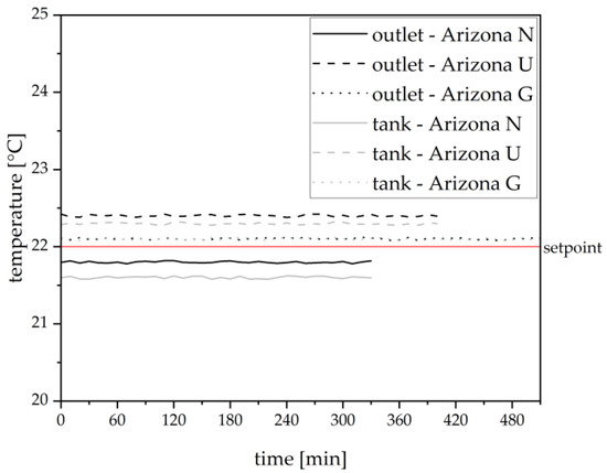 As can be seen in Figure 7, the mean temperature is 21.79 ± 0.01 °C (21.60 ± 0.01 °C in the tank) for Arizona N, for Arizona U it is 22.41 ± 0.01 °C (22.29 ± 0.01 °C in the tank), and for Arizona G the mean temperature is 22.10 ± 0.01 °C (22.11 ± 0.011 °C in the tank) at the outlet. The room temperature was 21.84 ± 1.13 °C—no significant shift in temperature is evident.