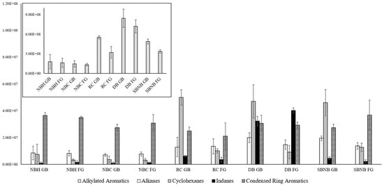 Absolute compound class distribution between storage temperatures (GB—room temperature, FG—refrigerated) for select packaging types comparing averages across replicates with standard deviation error bars for compound classes of interest in ILR analysis. Due to the vast difference in abundance, n-alkanes, cycloalkanes, indanes, and condensed ring aromatics are displayed on the y-axis at the ×107 scale (foreground), and alkylated aromatics are displayed on the y-axis at the ×108 scale (top left).