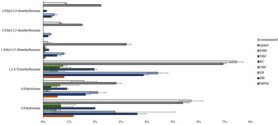 The trend between contaminated and spiked references shows higher concentrations of more volatile compounds in contaminated samples and higher concentrations of less volatile compounds in spiked samples, as follows: the overall expectations for cross-contamination transfer based on vapor pressures. The exceptions are 4-ethyltoluene and 1-ethyl-3,5-dimethylbenzene, which could mean a higher degree of matrix interaction with wood, resulting in a lower relative abundance than expected for the contaminated reference.